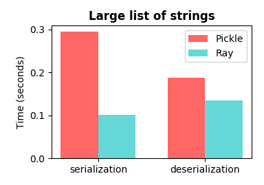 Note that the biggest wins are with deserialization. The speedups here are multiple orders of magnitude and get better as the NumPy arrays get larger (thanks to design goals 1, 3, and 4). Making deserialization fast is important for two reasons. First, an object may be serialized once and then deserialized many times (e.g., an object that is broadcast to all workers). Second, a common pattern is for many objects to be serialized in parallel and then aggregated and deserialized one at a time on a single worker making deserialization the bottleneck.