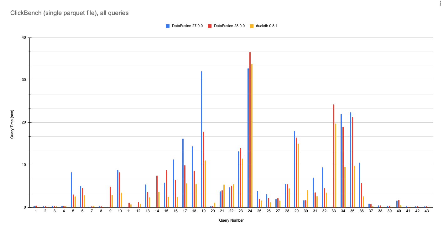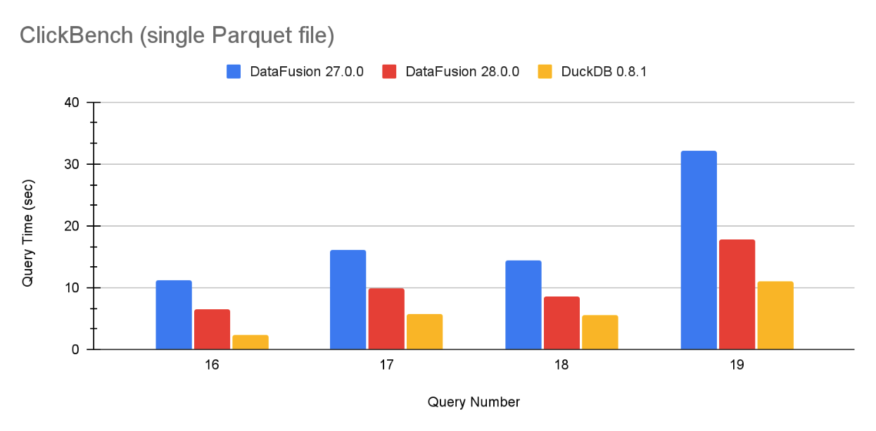 DataFusion now reaches near-DuckDB-speeds querying Parquet data. While we don’t plan to engage in a benchmarking shootout with a team that literally wrote Fair Benchmarking Considered Difficult, hopefully everyone can agree that DataFusion 28.0.0
