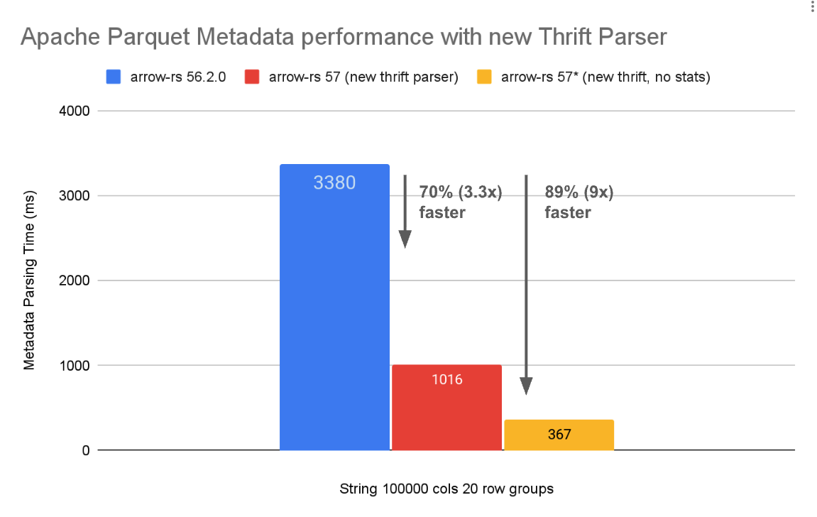 Ed Seidl (@etseidl) and Jörn Horstmann (@jhorstmann) contributed a rewritten thrift metadata parser for Parquet files which is almost 4x faster than the previous parser based on the thrift crate. This is especially exciting for low latency use cases and reading Parquet files with large amounts of metadata (e.g. many row groups or columns). See the blog post about the new Parquet metadata parser for more details.